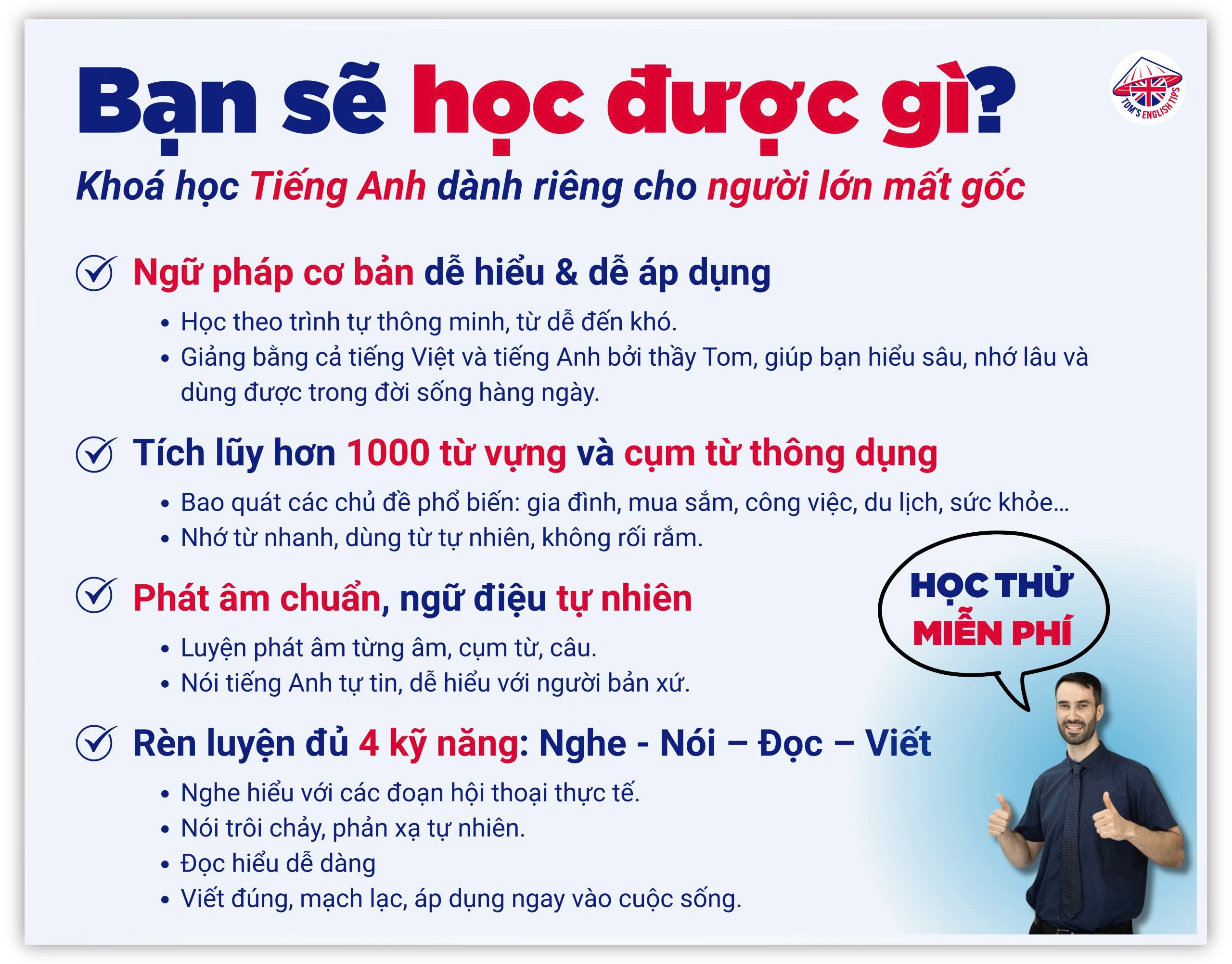Thầy Tom là giáo viên mình đã có cơ hội tiếp xúc trực tiếp bên ngoài, ngoài việc thầy cao dã man thì thầy còn rất thân thiện và đặc biệt lối biểu cảm diễn tả cho mình - trong lúc mình còn đang bập bẽ tiếng Anh làm mình thấy rất quý. Và đó là lý do ko thể bỏ lỡ khoá học này khi mình nghe tin thầy đăng lên fanpage . Rất ok và chi tiết mọi người ạ.