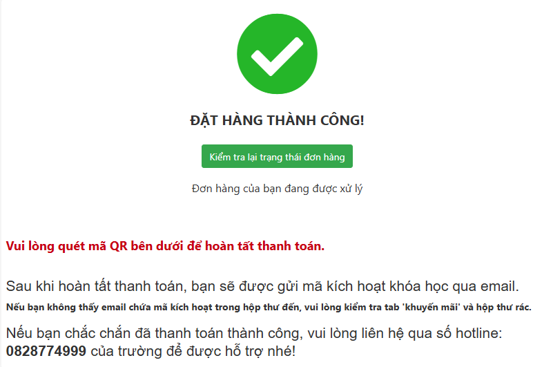 Bạn thanh toán giá trị khóa học đặt trực tiếp thông qua tài khoản ngân hàng của chúng tôi. Sau khi nhận được thanh toán, bộ phận vận hành sẽ gửi mã kích hoạt khóa học qua email. Thông tin tài khoản: